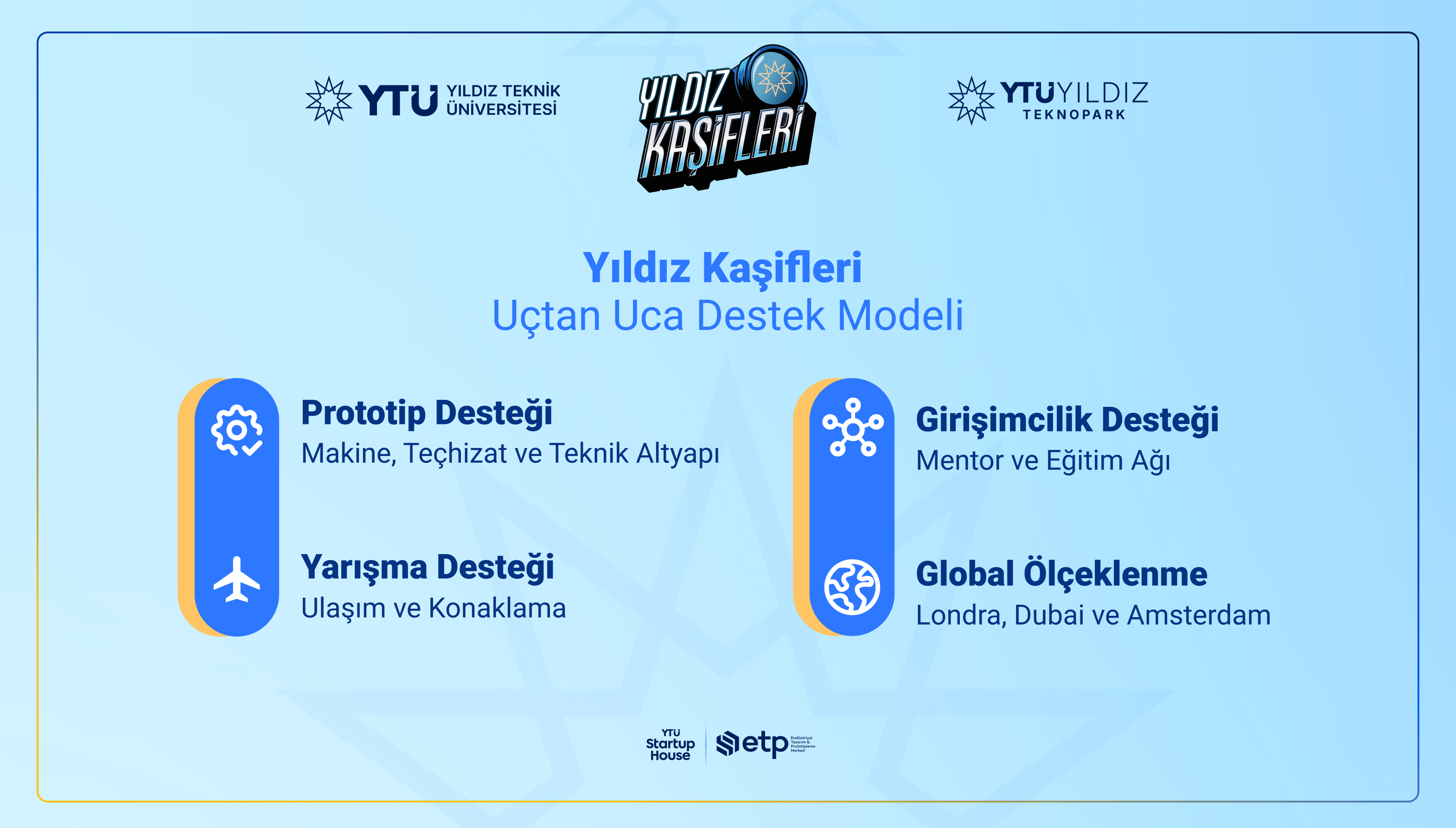Yıldız Kaşifleri, girişimcilere sunduğu 360 derecelik destek modeliyle klasik startup programlarından ayrışıyor. Girişimcilere, prototip geliştirme süreçlerinde ihtiyaç duydukları makine ve teçhizat temininden uluslararası prestijli yarışmalara katılım için ulaşım ve konaklama desteğine kadar uçtan uca kaynak sağlanıyor. Ayrıca, YTÜ Yıldız Teknopark’ın güçlü mentor ağından ve teknik altyapısından faydalanan takımlar, programın ilerleyen aşamalarında teknoparkın Londra, Dubai ve Amsterdam ofisleri üzerinden küresel yatırımcı ağlarına erişim ve uluslararası ölçeklenme fırsatı yakalayarak yerli teknolojiyi dünyaya ihraç etme fırsatı elde ediyor.
