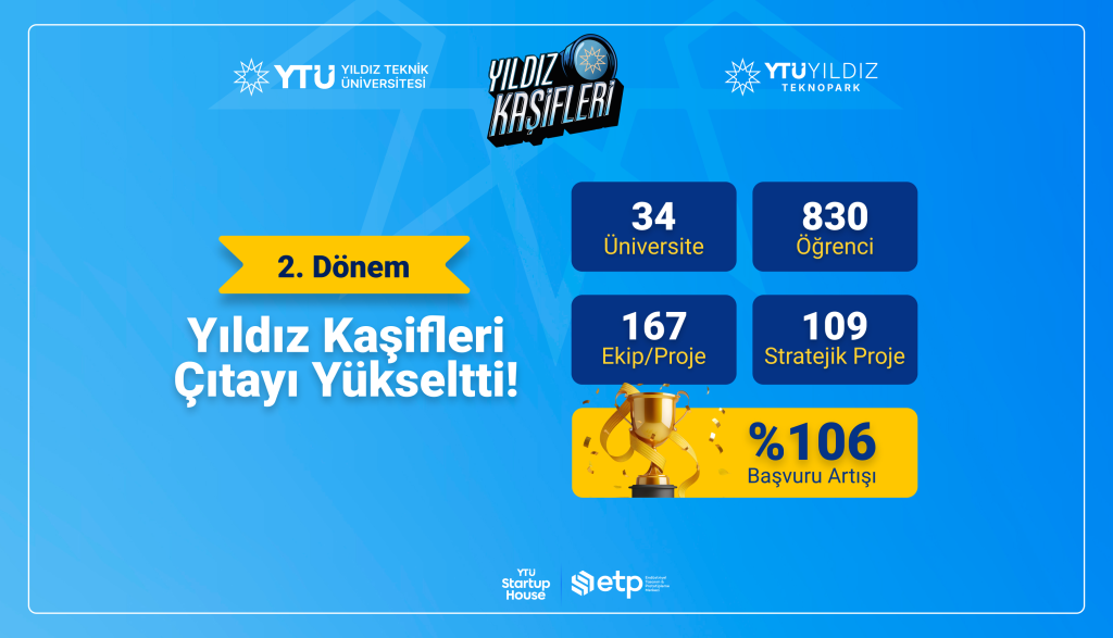 Yıldız Teknik Üniversitesi ve Yıldız Teknopark iş birliğiyle yürütülen Türkiye’nin üniversitelerarası en büyük girişimcilik programı Yıldız Kaşifleri’nin ikinci dönemine, YTÜ öğrencilerinin ekip lideri olduğu proje takımlarına 34 farklı üniversiteden öğrenciler katılım gösterdi. Toplamda 830 öğrenci ve 167 proje başvurusunun yapıldığı programda, proje sayısı ikiye katlanırken milli teknoloji hamlesinin lokomotifi savunma sanayii 50 proje ile ilk sırada yer aldı.