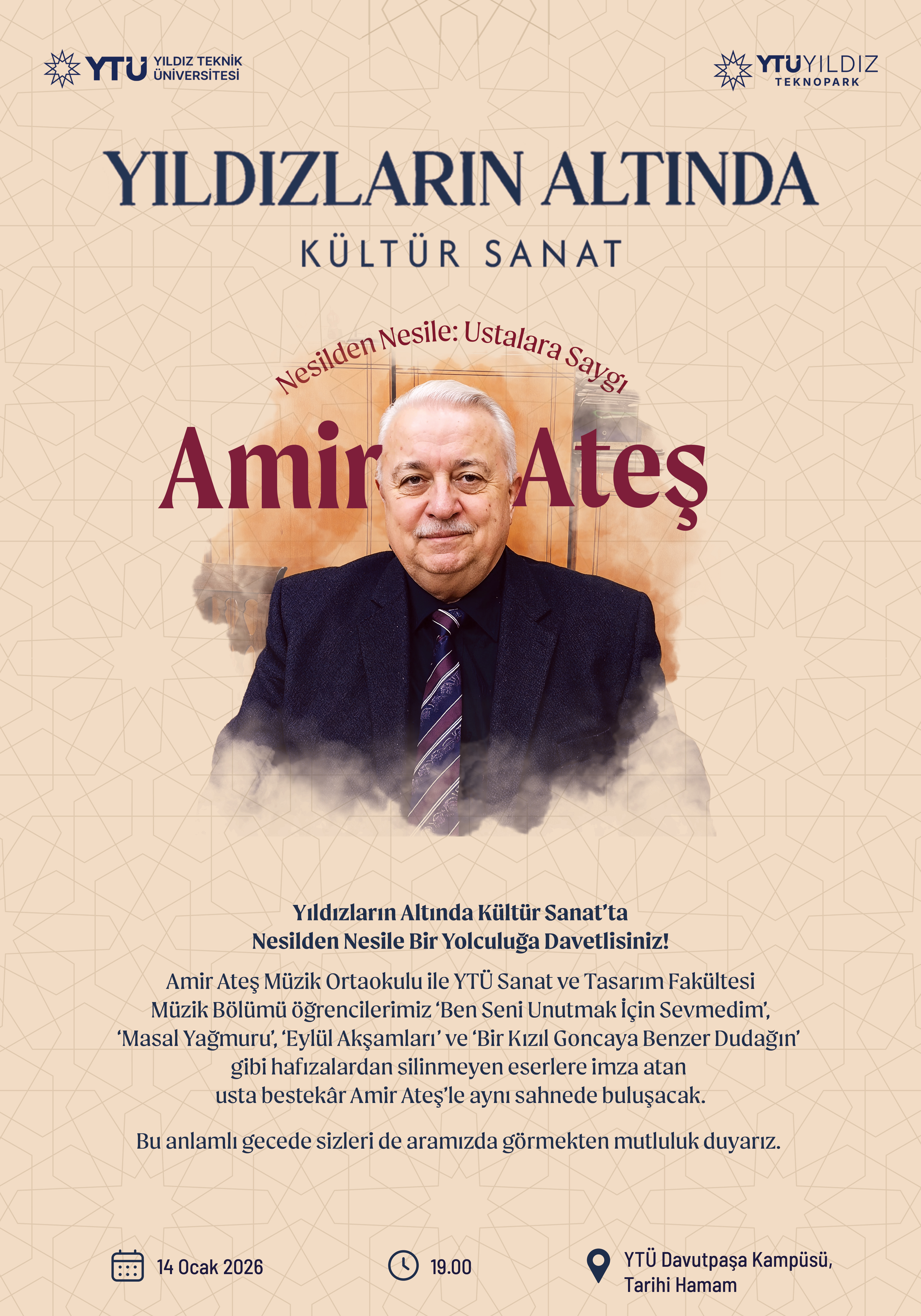 Amir Ateş Müzik Ortaokulu ile YTÜ Sanat ve Tasarım Fakültesi Müzik Bölümü öğrencilerimiz 'Ben Seni Unutmak İçin Sevmedim', 'Masal Yağmuru', 'Eylül Akşamları' ve 'Bir Kızıl Goncaya Benzer Dudağın' gibi hafızalardan silinmeyen eserlere imza atan usta bestekâr Amir Ateş'le aynı sahnede buluşacak.